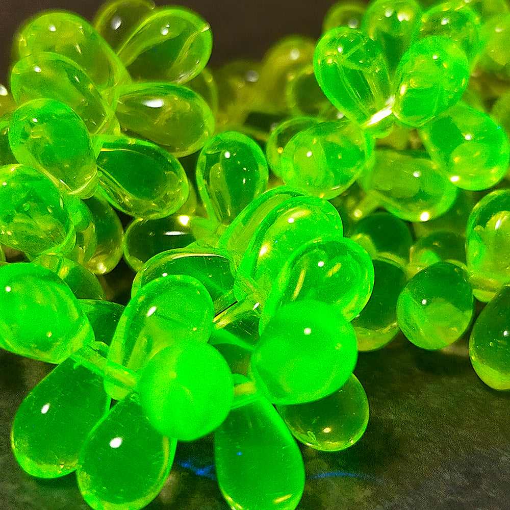 ブラックライトで淡く蛍光を放つ特性があり、コレクターやビーズ愛好家からも注目されています。