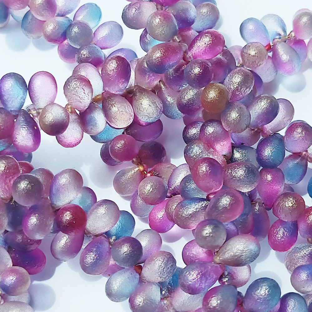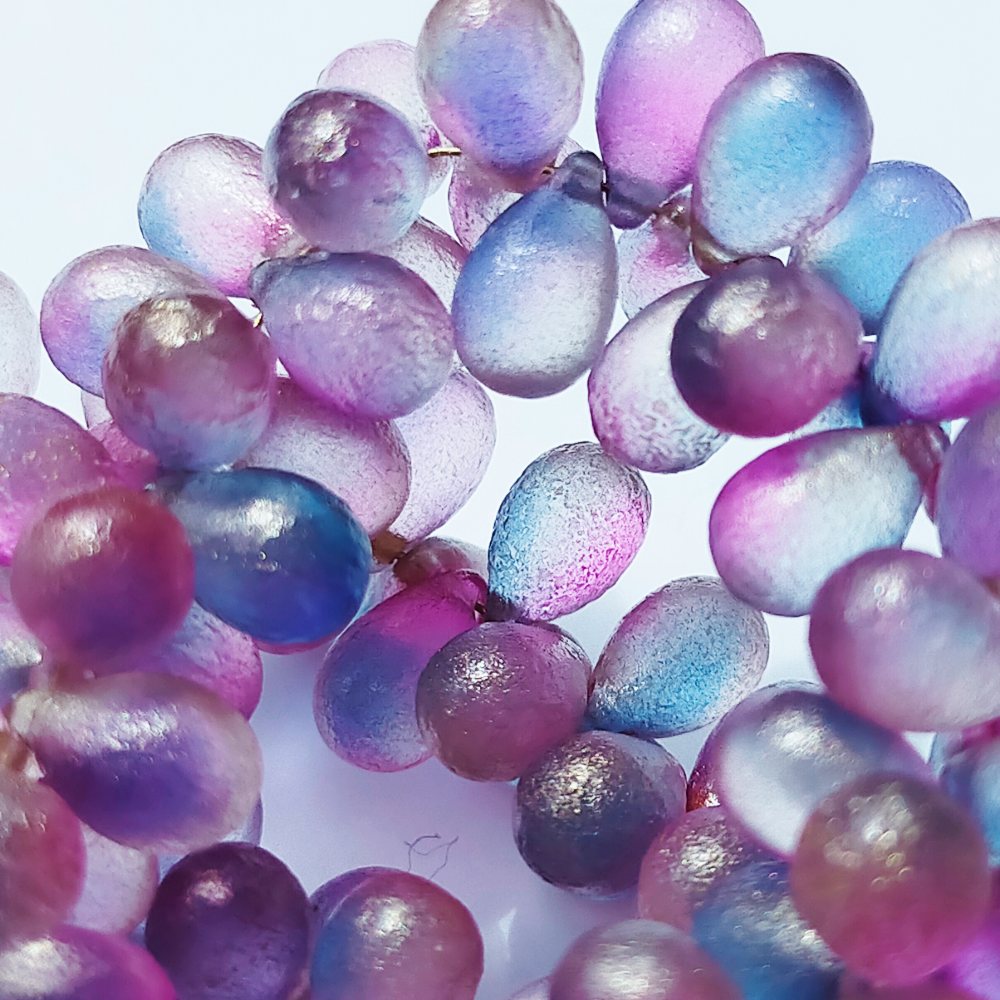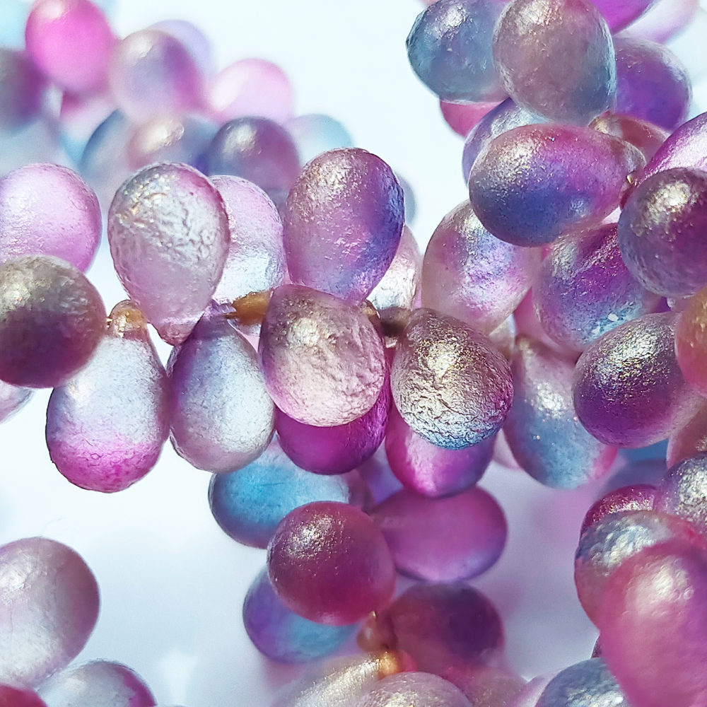 無色透明のフロスト加工を施したベースに、ムラサキ色のスプレー着色と淡いゴールドのペイントが重なり、幻想的で上品な色合いを表現しています。アクセサリーやクラフト作品に華やかさと奥行きを加えるビーズです。